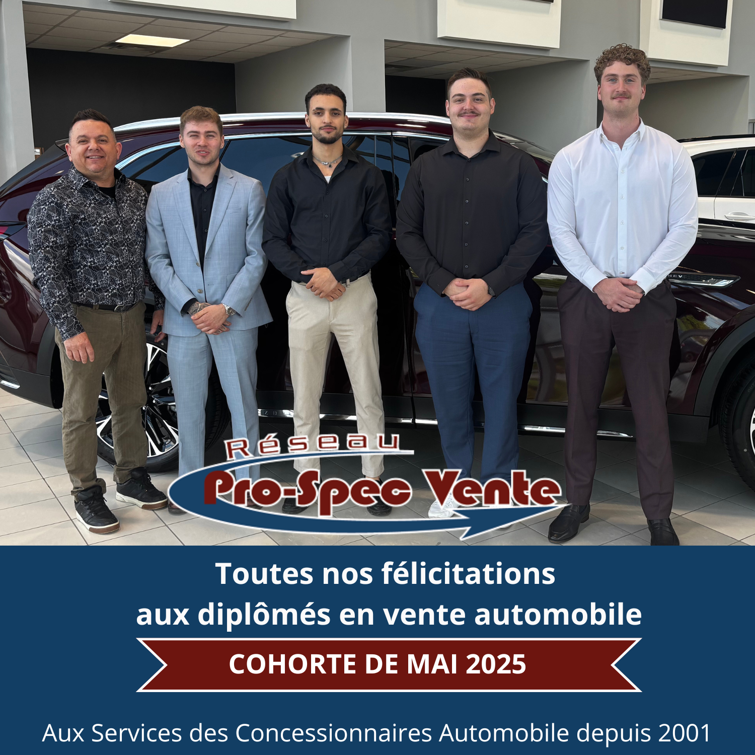 Tout d’abord, Pro-Spec Vente est fier de présenter ses plus récents diplômés de la formation intensive de 5 jours pour devenir conseiller à la vente automobile. En effet, ces futurs experts de la vente ont suivi avec succès une formation en présentiel du 26 MAI AU 30 MAI 2025 en Estrie. De plus, ils ont été rigoureusement sélectionnés pour leur potentiel et leur motivation. Par conséquent, ils ont tous décroché un emploi chez l’un de nos nombreux concessionnaires partenaires..