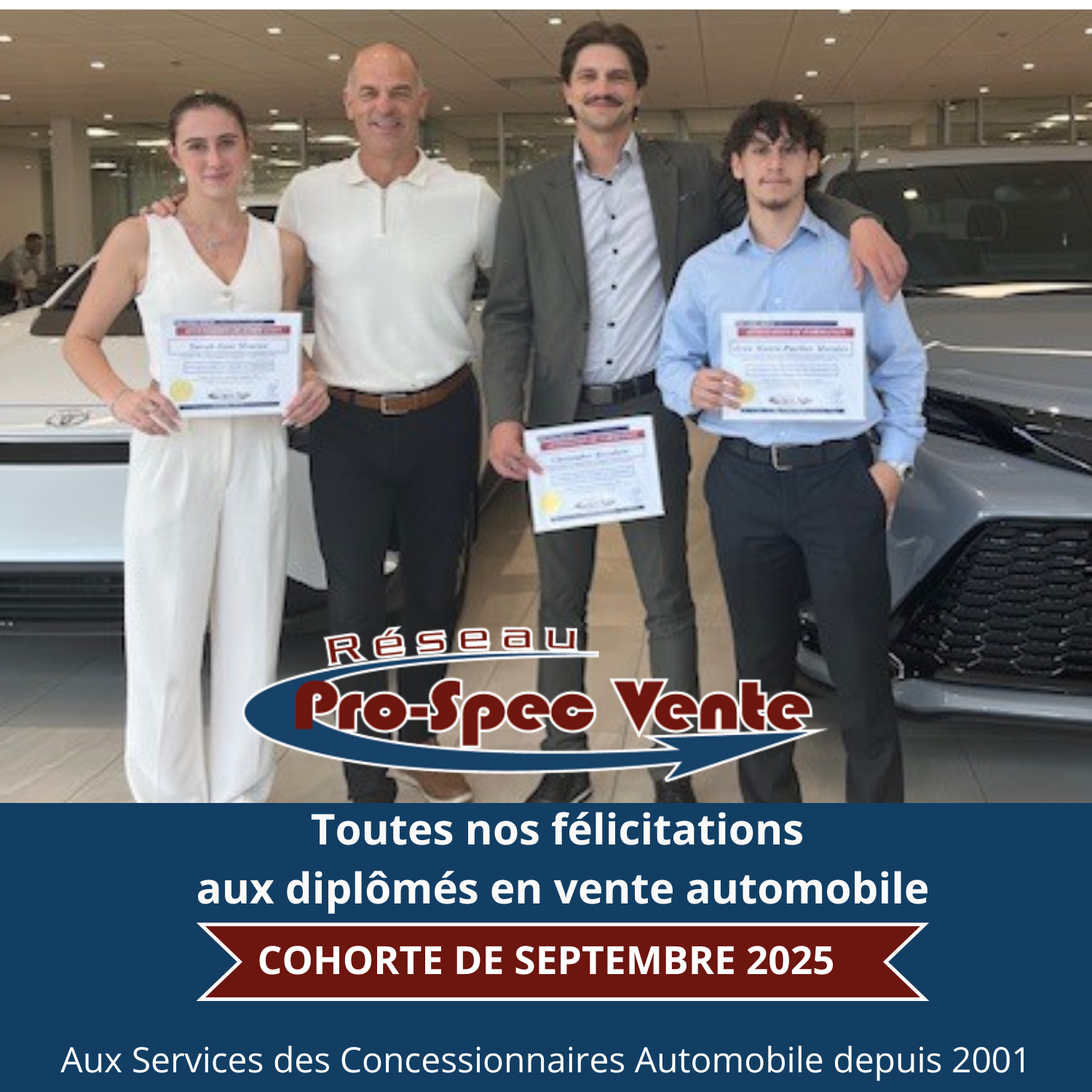Tout d’abord, Pro-Spec Vente est fier de présenter ses plus récents diplômés de la formation intensive de 5 jours pour devenir conseiller à la vente automobile. En effet, ces futurs experts de la vente ont suivi avec succès une formation en présentiel du  22 SEPTEMBRE AU 26 SEPTEMBRE 2025 dans la région de la RIVE-SUD. De plus, ils ont été rigoureusement sélectionnés pour leur potentiel et leur motivation. Par conséquent, ils ont tous décroché un emploi chez l’un de nos nombreux concessionnaires partenaires..